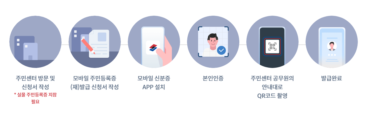 - 스마트폰에 IC 실물 주민등록증 태그 및 본인인증으로 재발급 가능합니다.